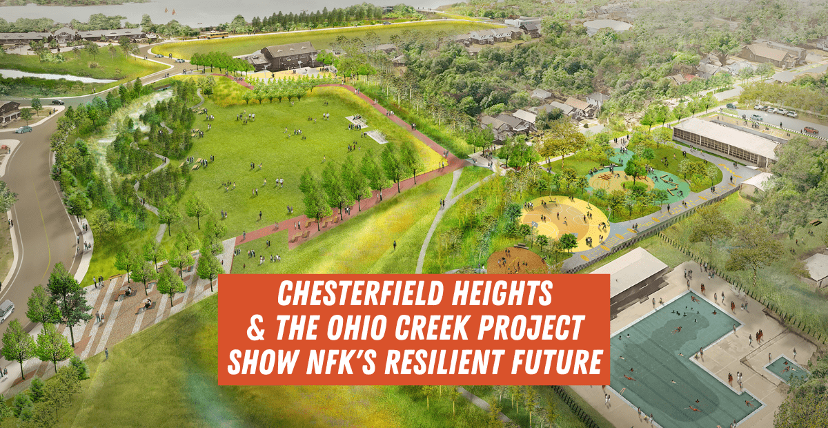 As this institutional engine begins to spin, the designs at Chesterfield Heights have evolved from student projects to massive government intervention. In May, I stood on a new berm stretching the length of Chesterfield Heights’ riverfront, about a mile long, parallel to Chesterfield Boulevard. Eight feet high and freshly planted with grasses, it feels like a giant, hardened sand dune, for now, gracefully curving with the shore. You can see the front and side yards of old river-facing houses from the top of the berm. The river is a little narrower here than downtown. Barges loaded up with timber pass by. And you can also see into Ohio Creek, the tributary that gives this assemblage of interventions or adaptations their award-winning name: The Ohio Creek Watershed Project.